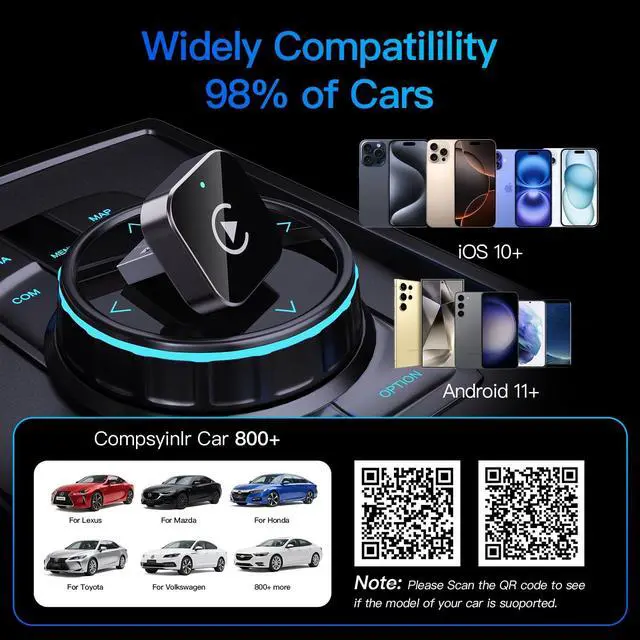 Play: Don't worry about disconnecting while driving for a long time, no app downloads or complicated settings. Just pair via Bluetooth and you can use it. After the initial setup, it will automatically connect to your phone and you start your car, which is very suitable for busy people, allowing you to enjoy the ultimate convenience of wireless CarPlay. ^^ The model is not currently supported: For Android car stereo/Android phone; non-factory wired car/BWM/Tesla/2016 Buick Lacrosse/2019 Honda CRV/2019 Acura RDX/2018 Mitsubishi Outlander.