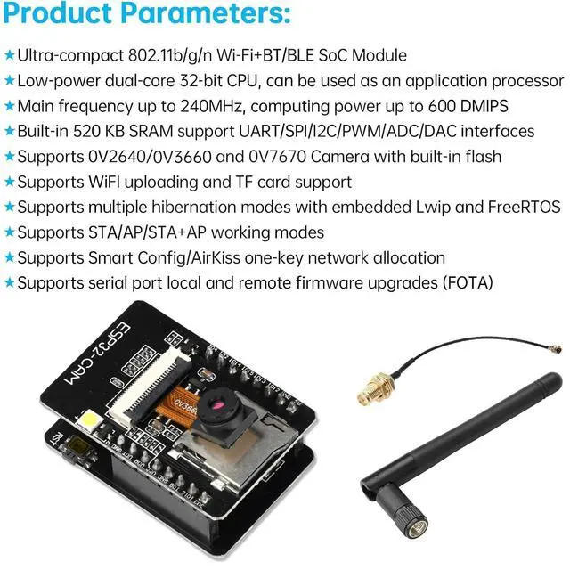 Upgrade: The original OV2640 camera has been updated to OV3660, with clearer and more stable image quality. The usage method remains unchanged, improving efficiency. ^^ A new W-BT dual-mode development board based on ESP32 design, using PCB on-board antenna, with 2 high-performance 32-bit LX6CPU, using 7-level pipeline architecture, main frequency adjustment range 80MHz to 240Mhz. ^^ ESP32-CAM-MB adopts Type-C interface, convenient and reliable connection method, convenient to apply to various IoT hardware terminal occasions ^^
