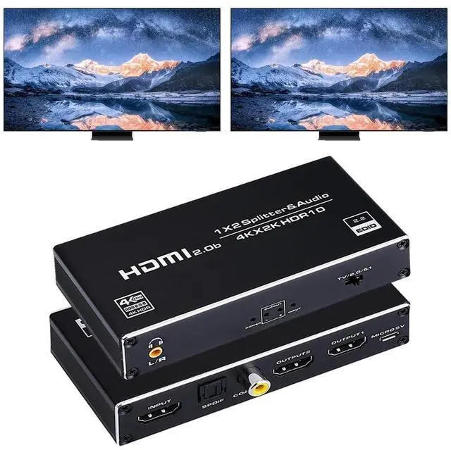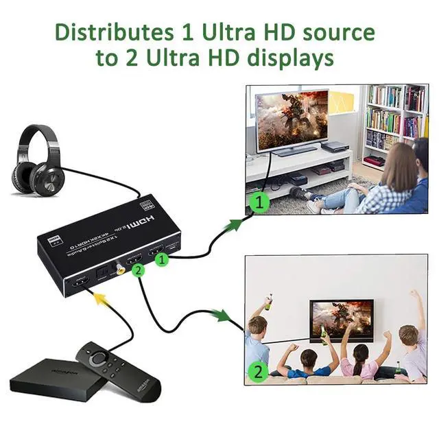 Out: The HDMI Splitter 1 in 2 Out allows distributes 1 HDMI source to two HDMI displays simultaneously and extract audio signals, And Extract HDMI Audio to 3.5 mm Audio jack + Coaxial + SPDIF Audio Port. And then display it on two HDMI displays simultaneously without any loss, lag, flash or drop in resolution.