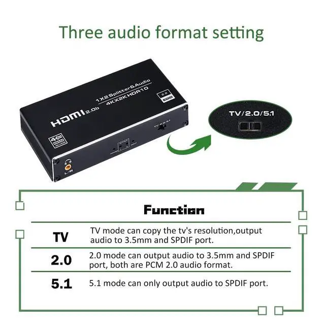 ^^ Three audio settings: This HDMI audio extractor extracts audio signal from HDMI signal soure and converts it to Optical Toslink SPDIF and Coaxial or 3.5 mm audio out. Set the audio format you need by switching the buttons TV/ 2.0 / 5.1. TV mode can copy the TV's resolution, output audio to 3.5 mm and SPDIF port; 2.0 mode can output audio to 3.5 mm and SPDIF port, both are PCM 2.0 audio format; 5.1 mode can only output audio to SPDIF port.