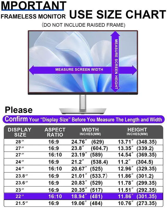 Width: 18.94 (481 mm), Height: 11.86" ( 301.35 mm), Display size 22 inch 16:10 FILMEXT Privacy Screen Filter is engineered to be ideally compatible with Sceptre, Acer, HP, Dell, ASUS, LG, SAMSUNG, Lenovo, ViewSonic, BenQ, Philips and other monitor brands. 90nm from the wave range of visible lights, reduces eyes stress. ^^ BLOCKING SIDE SNOOPERS2Pack-Monitor privacy screen 22 inch limits viewing angle to 30, thickness is 0.35 mm, Data is only visible in front of the display, and the image will be progressively harder to read out as the viewing angle increased, any attempting to steal a glance from the right or left will only be able to see a dark screen. Whether your with it in work (design/analyze data/follow market trends in real time, etc. ) or for gaming entertainment, it will provides great Privacy Shield. ^^ ANTI 69.7 % BLUE LIGHT&97% UV&EYE FATIGUE FILMEXT 22 inch computer privacy screen filter take self-developed upgraded composite materials, can block the harmful blue light between 380nm~490nm from the wave range of visible lights, long term visual comfortable, Reduce eye fatigue and reduces eyes stress.