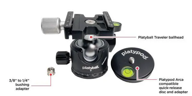 The included Arca-compatible quick-release disc doubles as a leveling aid and adapter. The 3/8"-16 female socket (with included 1/4"-20 adapter bushing) ensures compatibility with professional tripods and Platypod systems. The 90-degree ball notch rotation provides extensive positioning flexibility, making this ball head a versatile choice for photographers who demand precision and reliability in a compact package. The included Platypod disc ($ 18.50 value) with its bubble indicator is used for leveling a Platypod in critical applications such as astrophotography and precise horizontal panning. It is also a fully Arca compatible quick release plate and 3/8 to 1/4 adapter.