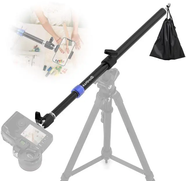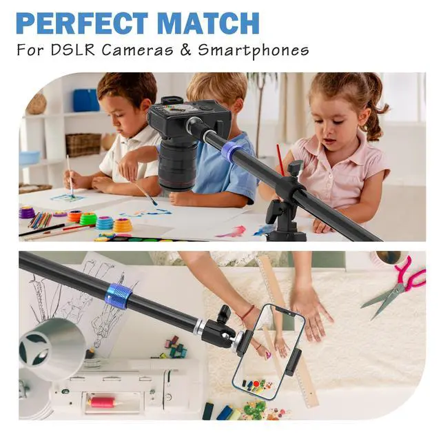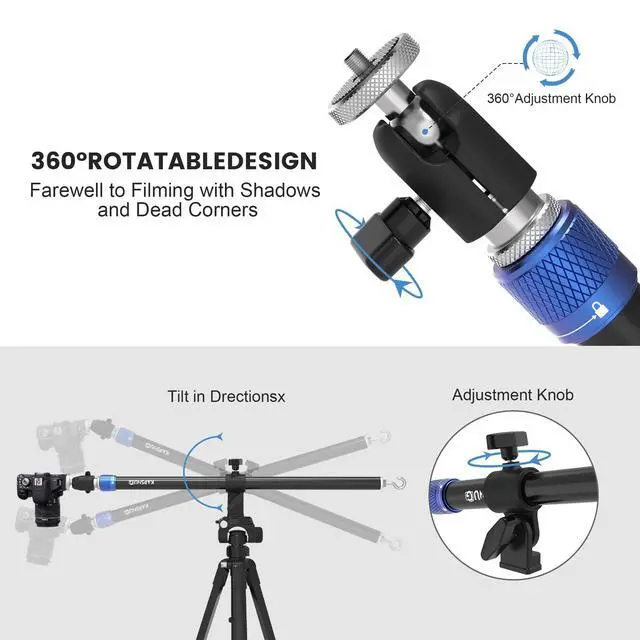 Reach New HeightsExtend your tripod extension arm from 22.4" to 37.8" for stunning overhead and wide-angle shots with your horizontal tripod. Perfect for creative studio or vlog setups ^^ Built to LastCrafted from heavy-duty, rust-resistant aluminum, this tripod boom arm stays stable even with demanding cameras reliable for every shoot ^^ Total FlexibilityAdjust the 170 boom arm and rotate 360 with the ball head get the perfect angle for your phone or camera every time ^^ Works with EverythingUniversal 3/8" & 1/4" screw ports make this tripod extension arm compatible with DSLRs, action cams, and smartphones.