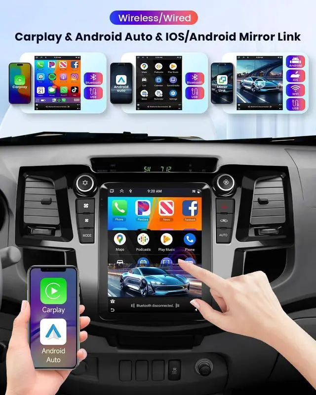 9.7 inch touchscreen: Enjoy a large and clear display with responsive touch control, which allows you to operate the device easily and comfortably. Support Split screen function enables you to view and use two applications simultaneously on the car's display. ^^ Wireless Carplay & Android Auto &