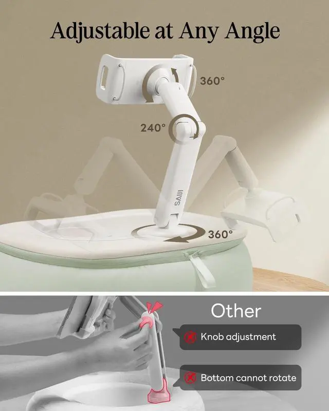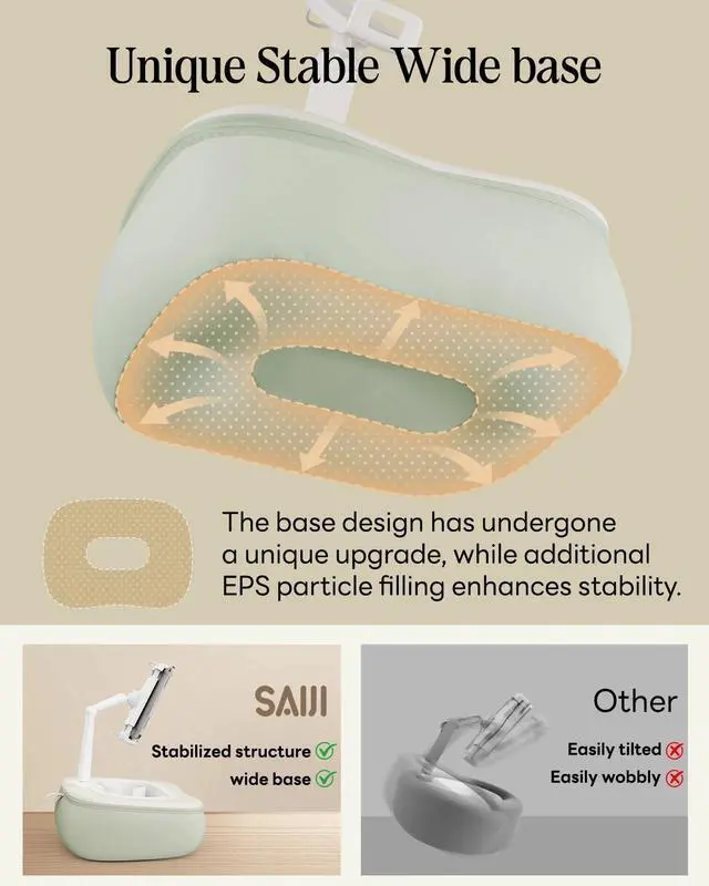 ^^ Dual-Axis DesignThe kindle Colorsoft holder support arm has a dual-axis design that enables the bottom axis to rotate 360, the middle axis to rotate 240, and the clamp to rotate 360, allowing users to adjust the angle according to their needs, so the phone stand can accommodate different usage scenarios, whether sitting, standing, or lying down. ^^ Upgraded Stable Wide BaseThe upgraded SAIJI Kindle stand abandons the traditional loose cushion base, innovatively adopting a high-density stitching process and filling with more EPS environmentally friendly particles, making the product more stable.
