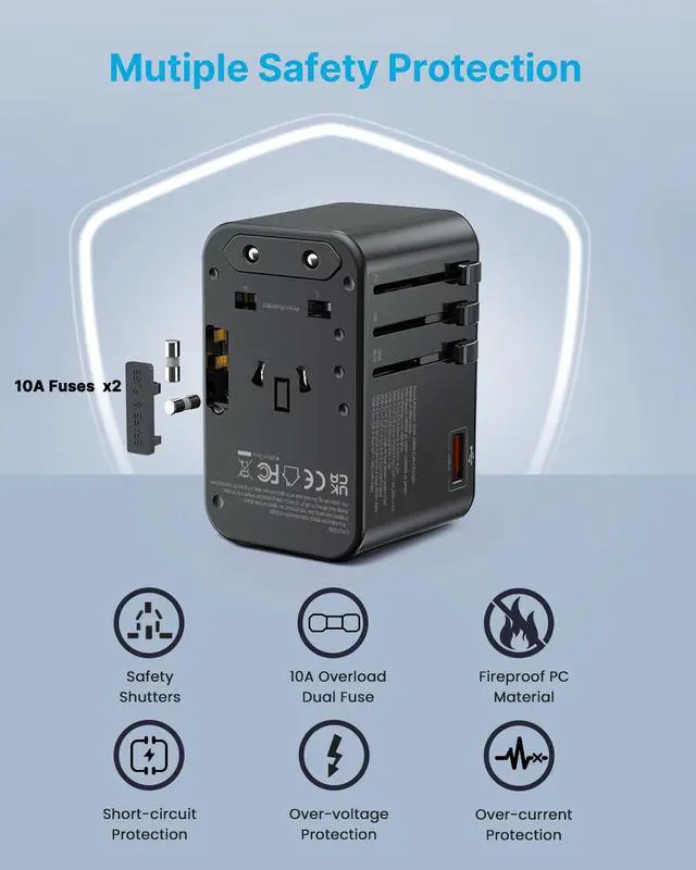 Quality Assurance: Advanced GaN technology makes this travel outlet adaptor charge faster, cooler and more efficiently. The lower charging temperature extends the service life. A 10A overload fuse provides overcharge protection by cutting off the current. The fire-resistant material makes this adapter non-flammable. It has safety shutters and a plug lock system that supports short circuit, over-voltage and over-current protection