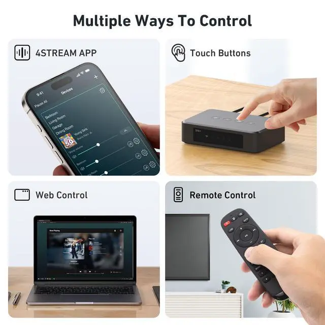 Remote Control Methods: With the Free 4STREAM APP, you can have full music management and control on smartphones or tablets: switching modes, setting up EQ, multi-room/independent playback, accessing preset content, adjusting WiFi settings, and updating firmware, etc. Web Control allows you to remotely control the device through any web browser by entering the IP address. Furthermore, touch buttons and remote control provide the easiest methods. ^^