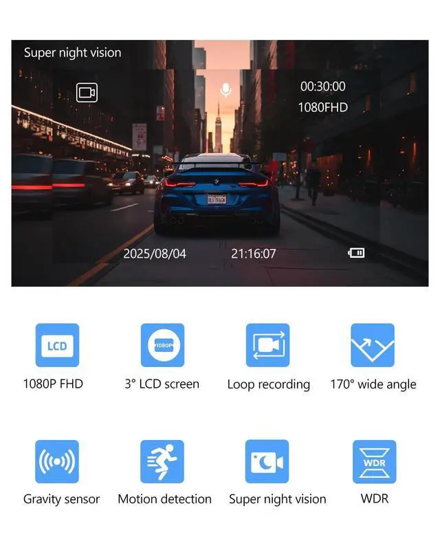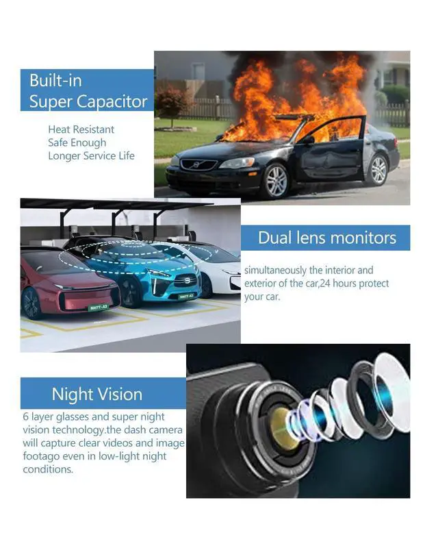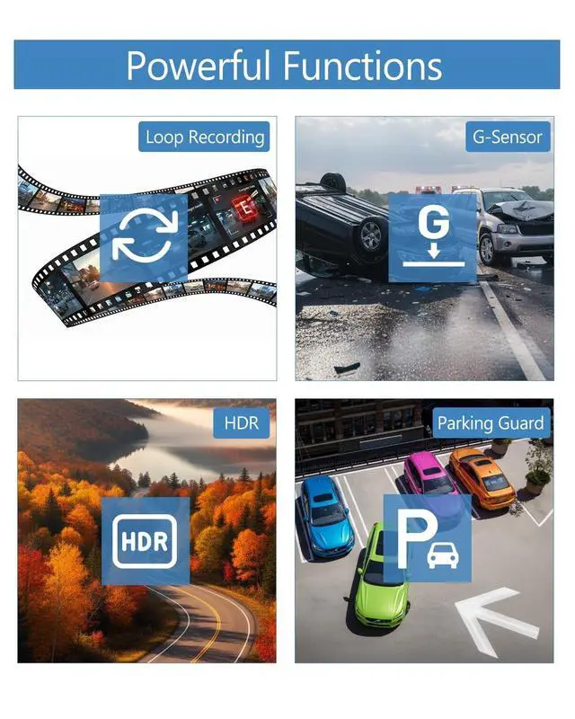 Dashcam Front and Rear Camera Dual Protection --- The dash cam front offers protection with 1080P front camera and 170 wide-angle lens, along with a waterproof rear camera. It delivers exceptional image quality, providing a wider field of view to minimize blind spots and accurately capture every moment of your drive, particularly in areas around the rear of your car that are often overlooked. The user-friendly interface and clear icons ensure quick recognition and easy operation of the device ^^ Dash Cams with Parking Mode --- These front and rear dash cameras automatically activate and start recording when an impact is detected, providing valuable video evidence if your car is scratched or damaged while parked.