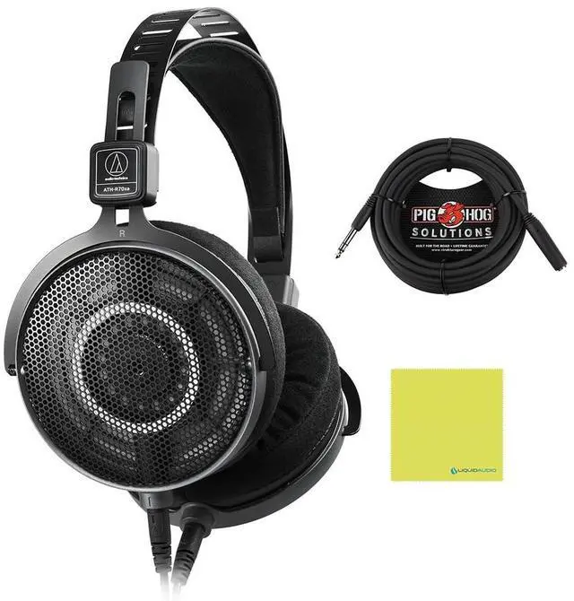 COMPLETE HEADPHONE BUNDLE Includes Audio-Technica ATH-R70xa Open-Back Headphones, 25ft Pig Hog Headphone Extension Cable (1/4") & Polishing Cloth, perfect for mixing, mastering & critical listening. ^^ PREMIUM OPEN-BACK DESIGN Provides unrestricted airflow to eliminate internal resonance, delivering ultra-fast transient response and a transparent, immersive listening experience. ^^ EXCEPTIONAL SOUND CLARITY Features a carbon composite resin structure for enhanced rigidity and detailed transients, plus an extended 5Hz40kHz frequency response for precise audio reproduction. ^^ LIGHTWEIGHT & COMFORTABLE Weighing just 199g, with a streamlined metal-reinforced headband and replaceable velour earpads, ensuring long-lasting comfort for extended studio sessions.