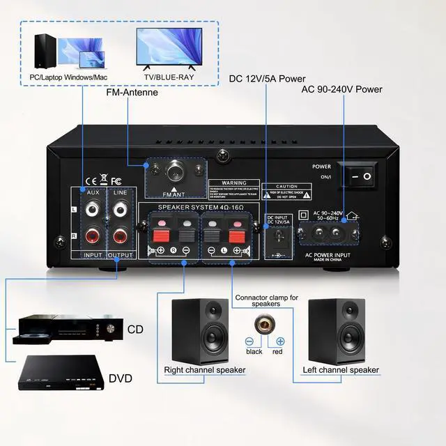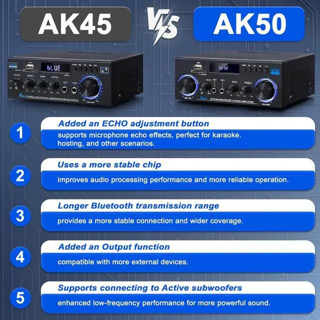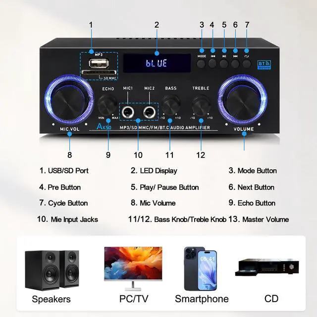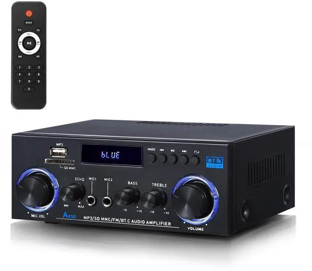 400W PowerAK50 Audio Amplifier is a multi-function home stereo amplifier, that provides maximum output of 400W + 400W. perfectly suitable for 4-16 inch passive speakers. This little BT amplifier which is perfect for karaoke, home theater, and acoustic sound systems. It's great for small apartments, bedrooms, offices, basements, and garages. Its compact size design fits easily into your bookshelf or A/V cabinets. ^^ Multiple Input & Multipurpose AK50 stereo amplifier, with Bluetooth, AUX, MIC, USB input, audio from external devices, such as CD, DVD, TV, PC, computers, tablets, notebooks, phones, MP3, and projectors with AV audio etc, Recommended for home TV audio, computer audio system-game, tower speaker, garden speaker.