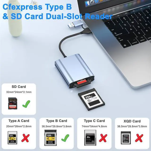 CF express type-b card reader: 10Gbps Ultra High-Speed - Zaievo CFexpress Reader is specifically designed for CFexpress Type B memory cards, supporting USB 3.2 Gen 2 (10Gbps) ultra-high-speed data transfer for CFexpress cards. To achieve 10Gbps speeds, your device's USB/USB-C port must support USB 3.2 Gen 2 specifications. SD card port is USB 2.0 speed with a theoretical transfer speed of 480Mbps ^^ CF card reader