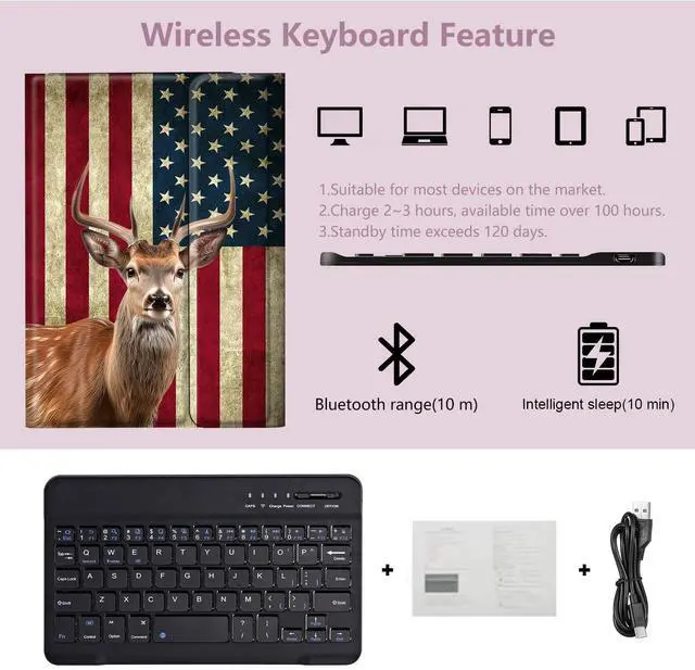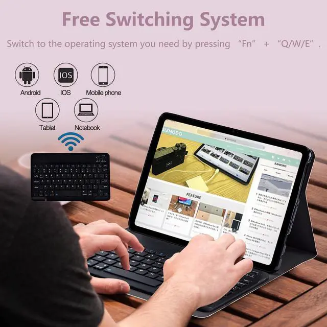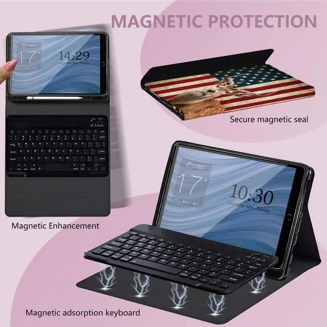 ^^ Keyboard Feature: This wireless keyboard for 10.2 inch iPad is compatible with most devices on the market. Match only once, then connect automatically. Bluetooth connection range 10 meters. Easily switch systems in one second(Android: Fn+Q, Windows: Fn+W, iOS: Fn+E). Charge 2~3 hours can be used for more than 100 hours, long standby 90 days. Super magnetic, won't fall off when lifted. Comes with USB charging cable and instruction manual. Perfectly matched iPad size, thin and stylish. ^^