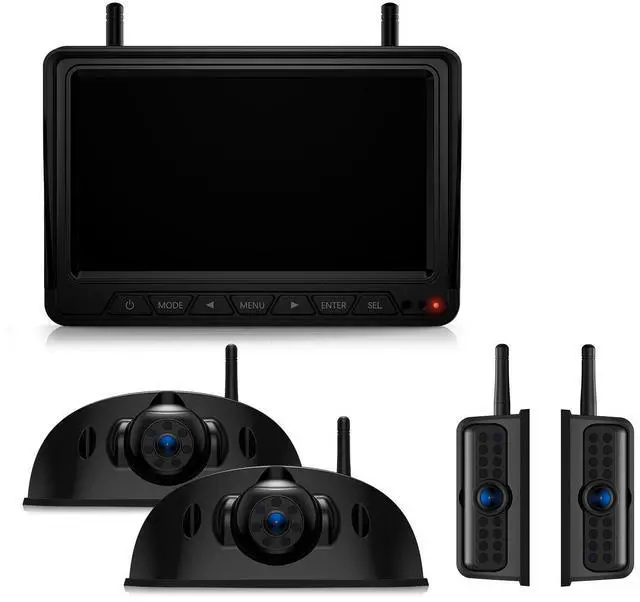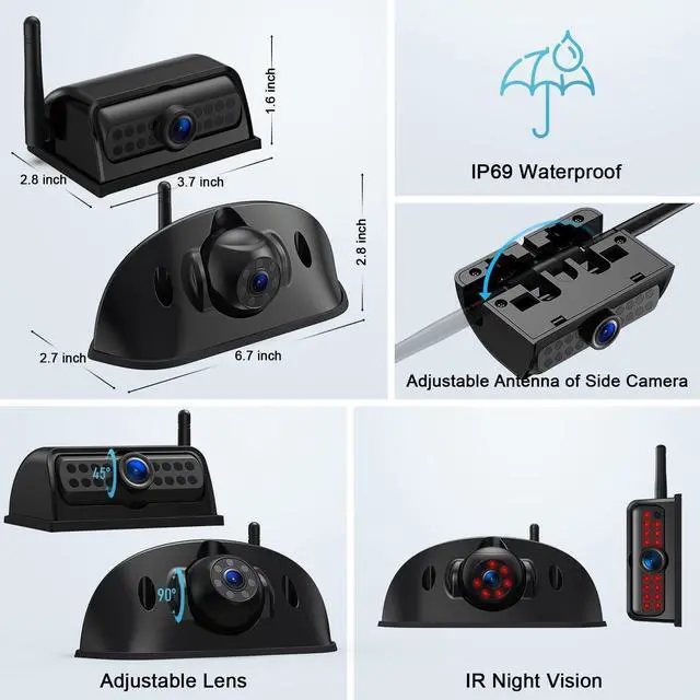 Night Vision: The HD side camera with IP69 waterproof and 120-degree viewing angle brings you the best view and longer product life. Equipped with 15 IR lights and a photoreceptor, the lights automatically turn on when the ambient light is low. Not fixed as a left-view or right-view camera, you can adjust the orientation of the screen image or re-pair it. The antenna is adjustable to face up or down as needed and has the option of being up or folded down. ^^ Dual Antennas for