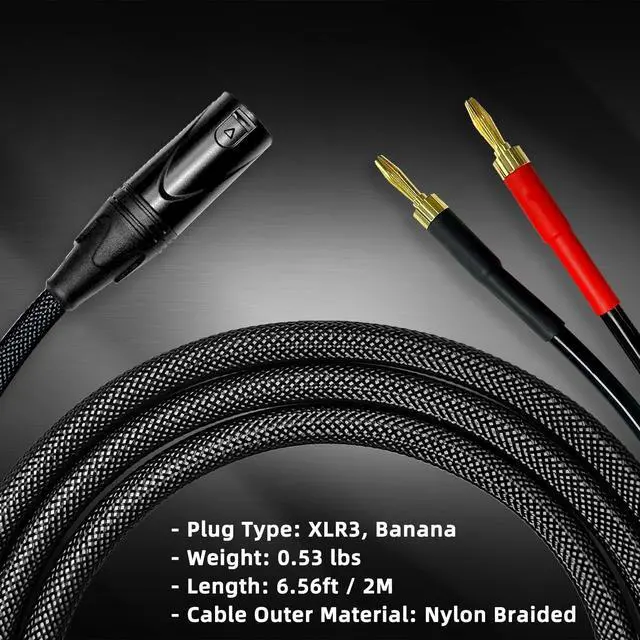 Specification1-Male XLR-3 Plug to 2-Male Banana Plugs, 6.56 ft/2M in Length, 12AWG, High strand count wires, Silicone Protective case and PVC Y-Boot cover can resist corrosion, electrical resistance and not easily damaged. High-quality outer Nylon Braided provides strength and flexibility, and hard to tangle and knot, to ensure more than 25000 bending life, extend the using time. ^^ PerformanceThis speaker wire with banana plugs provide a excellent sound transmission. High-quality materials enable the product to perform at its best. The XLR to Banana audio cable simplifies the connection so that you can enjoy pleasant music on high-end devices.