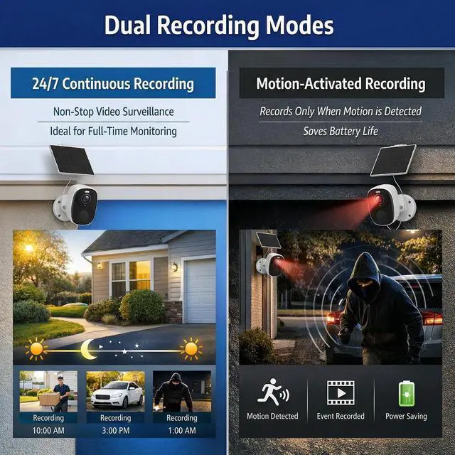 Built for year-round outdoor use, it works reliably as an outside camera for homes, garages, farms, cabins, and off-grid areas. ^^ 2K HD Surveillance Camera with Color Night Vision Capture sharp details with this advanced surveillance camera featuring 2K HD resolution and color night vision. The built-in spotlight delivers full-color images up to 33 ft, helping identify faces, clothing, and vehicles. Automatic day/night switching ensures clear footage around the clock, making it a dependable option among modern outdoor cameras. ^^ Dual Recording Modes for Wireless Cameras for Home Security This wireless camera outdoor supports two recording modes to match different security needs.