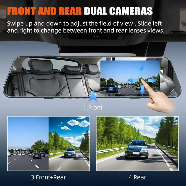 720P Mirror Dash CamUpgrated 4.7 inch rear view mirror equipped with 720P front camera and 720P rear camera. Using large-diameter front and rear lenses and mature WDR technology. It has aurora capture technology, which can make the image bright and dark when encountering tunnels, night lights, etc. Adjustable front camera and 170 rear camera cover almost total field of view to reduce blind spot area and capture more scenes on the road ^^ Superior Night Vision Dash CamHDR wide dynamic processing technology, imaging is more clear. Intelligent anti shake technology, the image is not blurred.