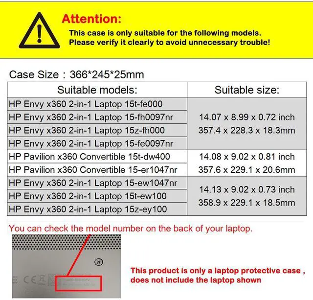 This case fits Model: HP Envy x360 2-in-1 Laptop 15t-fe000 HP Envy x360 2-in-1 Laptop 15-fh0097nr HP Envy x360 2-in-1 Laptop 15z-fh000 HP Envy x360 2-in-1 Laptop 15-fe0097nr HP Pavilion x360 Convertible 15t-dw400 HP Pavilion x360 Convertible 15-er1047nr HP Envy x360 2-in-1 Laptop 15-ew1047nr HP Envy x360 2-in-1 Laptop 15t-ew100 HP Envy x360 2-in-1 Laptop 15z-ey100You can check the model number on the back of your laptop.