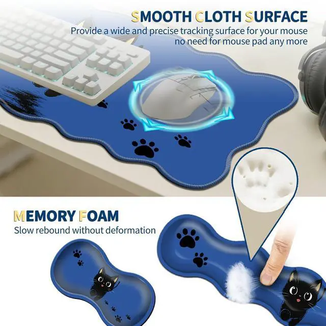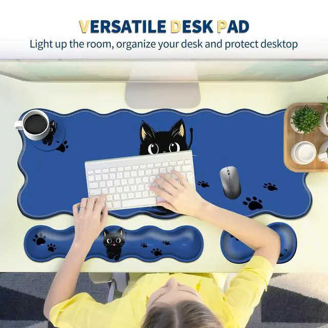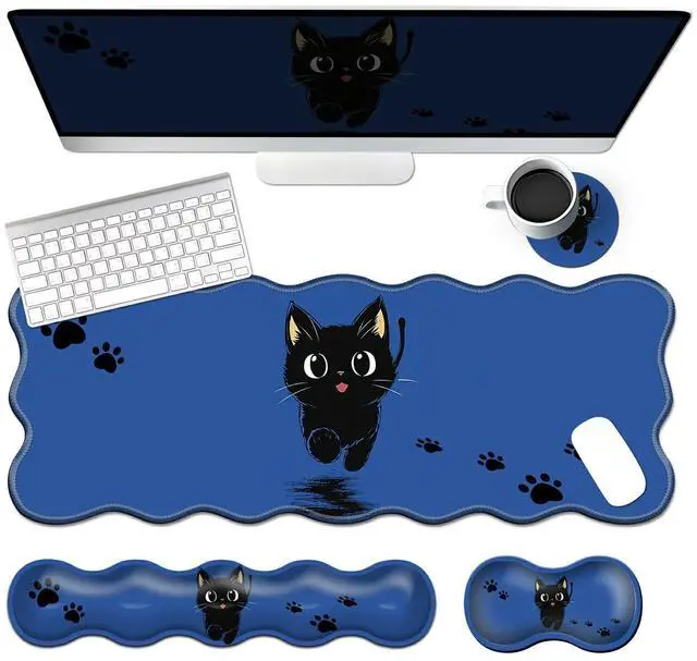 4-Piece XXL Gaming Mouse Pad Set (31.5"x11.8") with Keyboard Wrist Rest,Mouse Wrist Support & Coaster,Ergonomic Non-Slip Desk Mat for Office & Home,Cute Black Cat