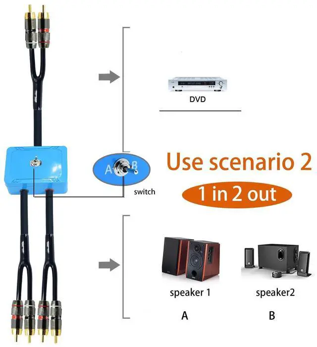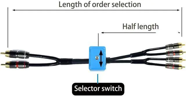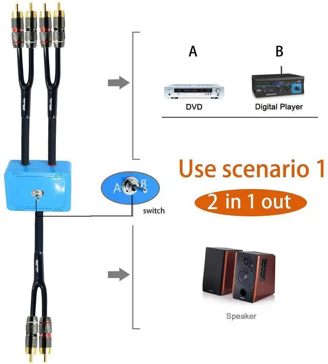 20ft Sound Channel swicher 2 male to 4 Male RCA Switch Selector 2 input 1 Output R/L Stereo Audio 1 in 2 Out Stereo Audio Splitter with Mute Button No External Power Required CD Speaker DVD Playe