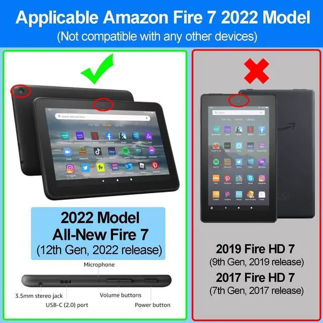 Compatibility- Specifically designed for All-new Kindle Fire 7 tablet [12th generation, 2022 release]; CAN NOT FIT Kindle Fire 7 Tablet (9th/7th generation, 2019/2017 release). Please Check Your Device Model Before Purchase. ^^ Full Protection- Fire 7 (2022) tablet case 12th generation was made of premium synthetic leather exterior and soft microfiber anti-slip synthetic interior, soft and durable, keep the screen prevent from finger prints, dirt, and scratches. ^^ Stand Design- Convenient stand position for watching movie or typing, and offer a cozy angle to view and let your hands free.