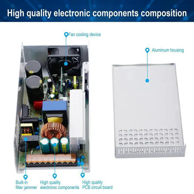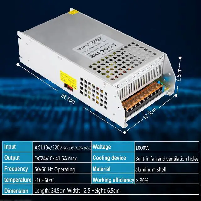 Universal ACPower LED Driver; output power 24V 41.6A 1000W, output current depends on the requirements of power consuming devices, provides different current/wattage for multiple devices (peak power is not equal to maximum load current/power). ^^ High Quality24v Power Supply, High quality flux material and multiple ventilation holes, the matt aluminium housing provides good heat dissipation and has a built-in status indicator for easy operation and use. ^^ Safety CertificationUniversal Regulated Switching Rigorous testing before leaving the factory, stable performance long service life; RoHS/CE/LVD/EMC safety certification; Lead-free process, in accordance with environmental protection RoHS requirements.