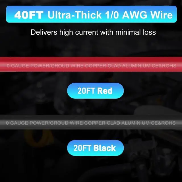 Package Includes: 40FT 1/0 Gauge Wire Copper Clad Aluminum CCA (20FT Each for Black and Red), 10PCS 1/0 AWG-3/8 (SC50-10) Battery Lugs Terminal Connectors, 10PCS 1/0 AWG-5/16 (SC50-8) Battery Lugs Terminal Connectors, 20PCS 3:1 Heat Shrink Tubing