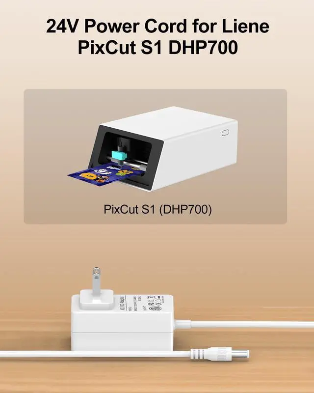 [Compatible Models] This power supply for Liene PixCut S1 DHP700 Color Sticker Printer & Cutting Machine ^^ [Product Details] Fits Liene PixCut S1 DHP700 power supply features universal AC input ranging from 110V to 240V, making it suitable for use worldwide. It delivers a stable output voltage of 24V, ensuring efficient charging. Additionally, the power cable extends up to 3.9 feet, providing ample reach for convenient use ^^ [Safety Reliability] The Liene PixCut S1 power cord replacement is engineered with safety features to ensure reliable performance, stable power supply to your machine.