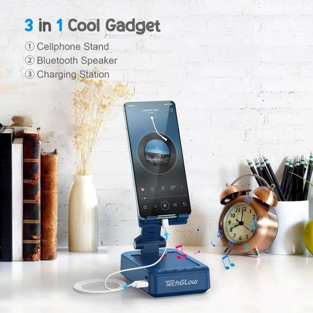 3 in 1 Multifunctional GadgetBluetooth Speaker + 360 Rotatable Phone Stand +Charger Stand.This versatile device combines wireless Bluetooth speaker, charger stand and phone holder into a perfect tech gadget. It brings a lot of convenience for watching videos and making hands-free phone calls. It delivers stunning sound with enhanced bass, tight mids, and crystal clear highs without distortion at any volume.
