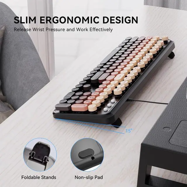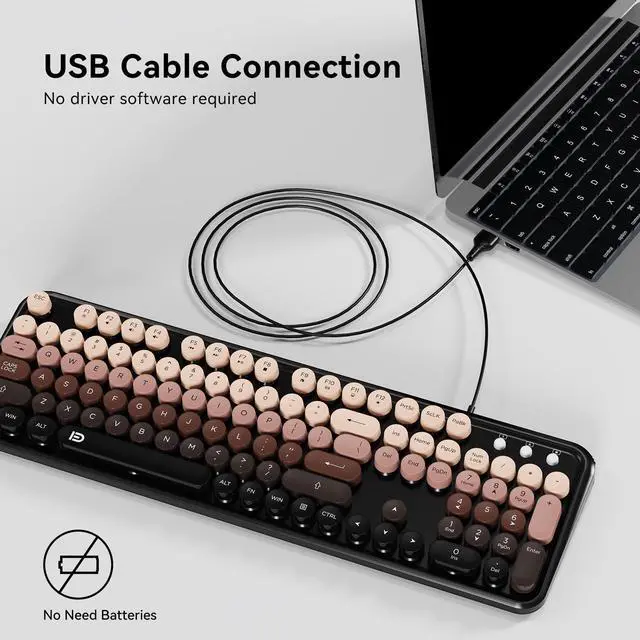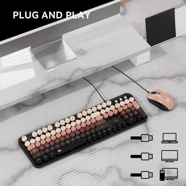 Fashion & Wired Mouse and Kyeboard - Stylish retro wired keyboard and mouse wireless with colorful round 104keys and glossy smooth edges to brighten your workspace. Featuring low-profile whisper-quet technology, this sleek combo ensures a distraction-free typing experience. Perfect for modern desks seeking cute wired keyboard and mouse aesthetics. ^^ 12 Hot Keys for Ultimate Efficiency - Multifunctional wired keyboard with mouse includes 12 hotkeys for media control, email, and search. Optimized for computer keyboard and mouse users in work, school, or entertainment. Streamline tasks with easy-access shortcuts.