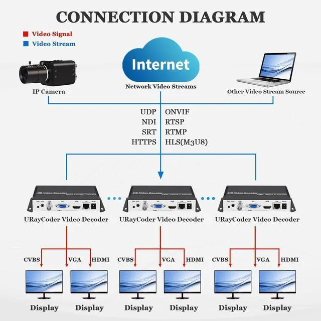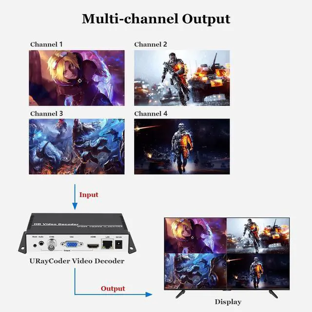 Innovative Product with Leading Technology- This URayCoder IP video decoder is ideal for decoding multiple types of video streams, support multi-brand video encoders and set-top boxs as well as IP camera decoding. ^^ Simple Setup- Enter the link address of the video stream in the configuration interface of video decoder, the output video will be automatically displayed on the display. ^^ Multi-channel Decoding- Support multi video streams decoding and output simultaneously. Max support 4 channels decoding and output at the same time. ^^ Multi-protocol Supporting- Support HTTP (S), RTSP, RTMP, SRT, HLS (M3U8), UDP, RTP, Multicast, Unitcast, FLV, ONVIF etc streaming protocol decoding.
