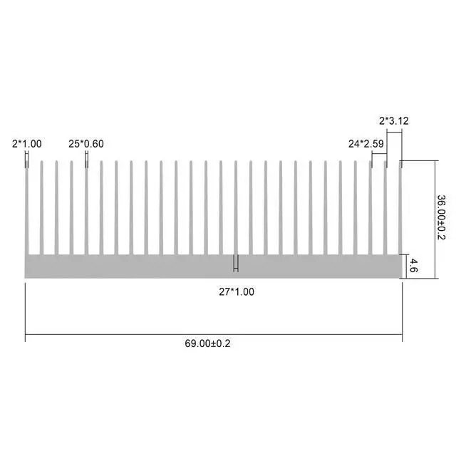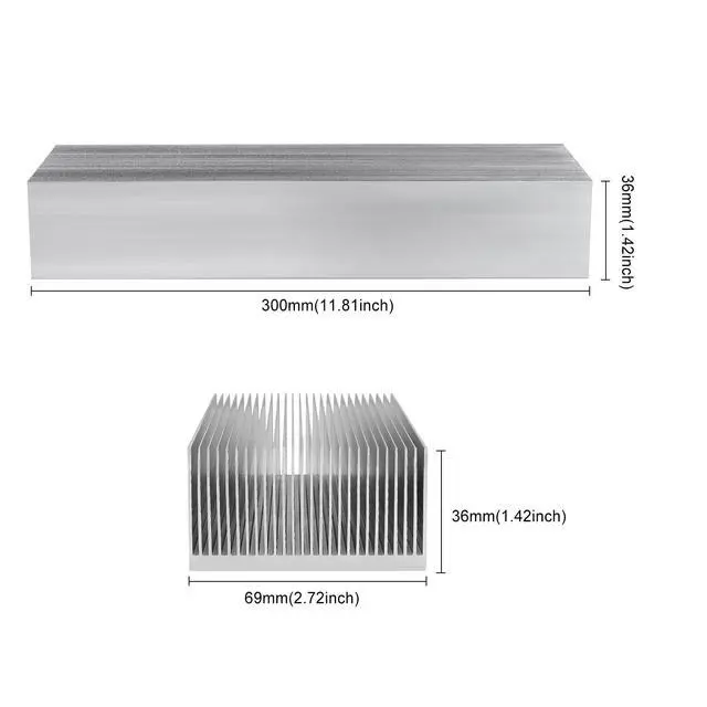 ^^ Heatsink Size: 300 x 69 x 36 mm / 11.8 x 2.71 x 1.41 Inch. ^^ Widely used for computer, Power Transistor, FET, IC, Power Amplifier, Voltage Regulator, MOSFET, SCR etc. ^^ Maximize surface area Designed in contact with the cooling air. The 27pcs fins increase the area of the board and thus provide for greater heat transfer ^^ For need other sizes or oxidation of this model, contact the seller of this product model as soon as possible.
