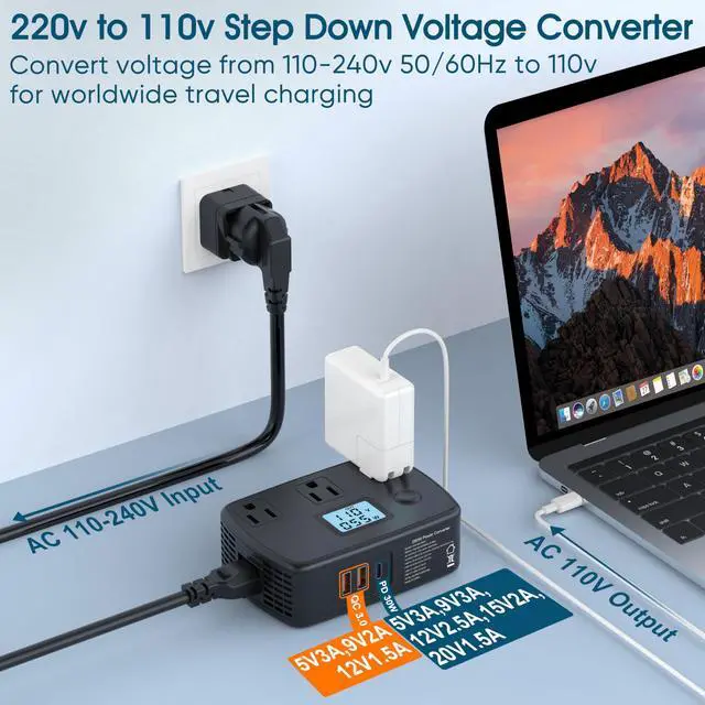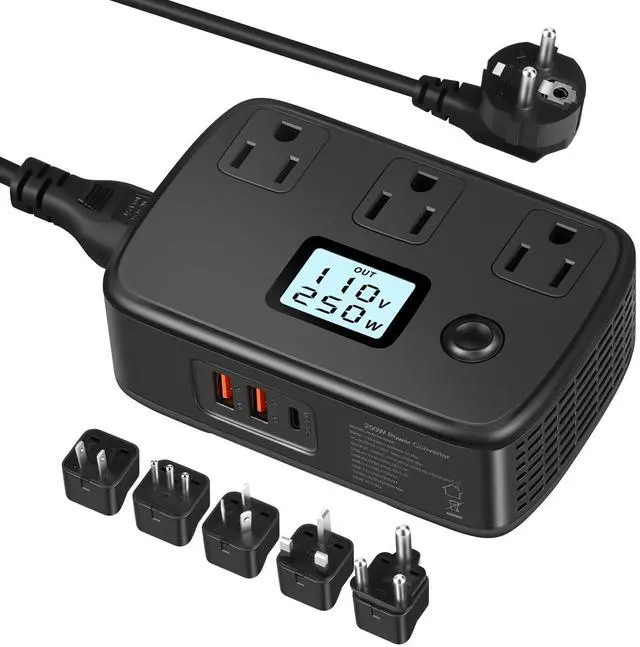 OUT status: the real voltage and the power of your devices will be visible ^^ [Voltage Converter with Real Quick Charge] - This converter provides PD 30W and QC 3. 0 USB ports, supports USB quick charge like special PD charger, and the charging speed will be 3X faster ^^ [Converter for European Travel with International Plug Adapters] - Comes with Europe type F/E power cord plug, plus with replaceable adapters which are UK-G, AU-I, Asia-A, Italy-L, South Africa-M and D, over 220+ countries are using these plug types ^^ [Voltage Converter 220 to 110 with PD & QC USB + AC Charging] - 3 AC outlets + 2 QC 3.0 + 1 PD 30W ports, you're able to charge up to 6 devices simultaneously, it will satisfy your charging need even for family travel (AC Total