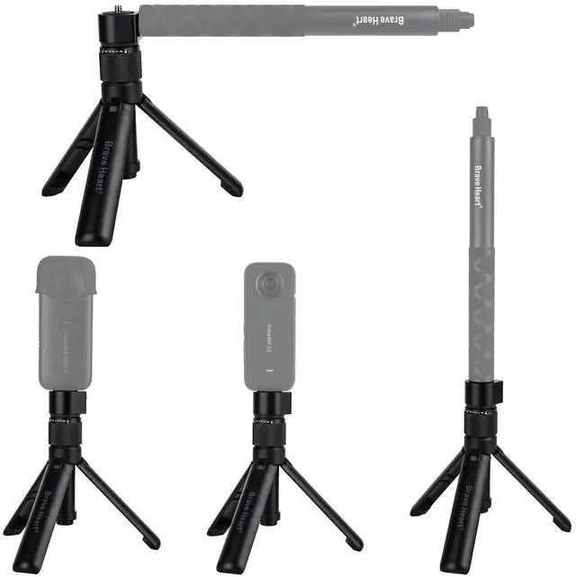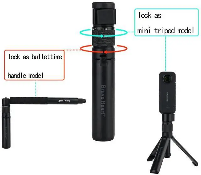 Multi-Function Tripod The tripod can be deployed on ground or assembled on the selfie stick as a handle to shoot bullet time videos. Also, the 1/4 inch screw allows it to connect the camera directly. ^^ Compatibility Designed for bullet time shooting, and compatible with Insta360 X5/X4 ONE X3 ONE X2 ONE R, ONE X, ONE, EVO Action and many more. ^^ Smooth and StableThe 360 degrees rotation handle can turn smoothly and firmly, which makes the video captured has a perfect clarity. ^^ Matte SurfaceMatte finished surface, feels goog when holding.