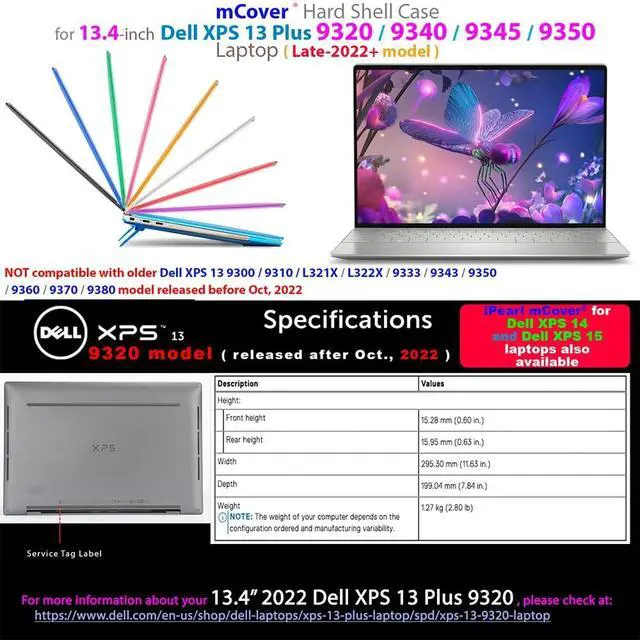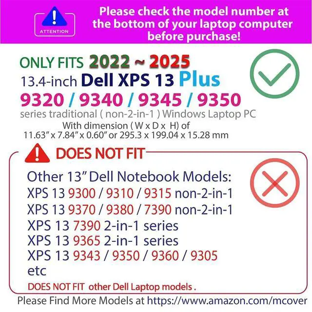 NOTE: Before placing order, PLEASE make sure to verify your laptop model number as this case is MODEL specific and NOT interchangeable. ^^ NOT fitting other Dell XPS 13 / 15 / 17 laptops. NOT compatible with ANY other Dell laptops as well. ^^ Made of high-quality translucent polycarbonate material which is shatter-proof and will protect your 2022 - 2025 13.4" Dell XPS 13 Plus 9320 / 9340 / 9345 / 9350 non-2-in-1 series Notebook Computers all around ^^ Designed to perfectly fit the 2022 - 2025 13.4" Dell XPS 13 Plus 9320 / 9340 / 9345 / 9350 non-2-in-1 series Notebook Computers with dimension of 11.63 x 7.84 x 0.60 inch ( 295.3 x 199.0 x 15.28 mm ) ^^ 2-piece light-weight ( 7.5 oz or 213 g ) shell easily snaps on and off.