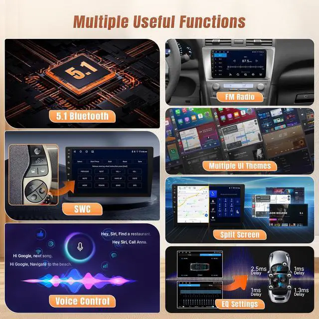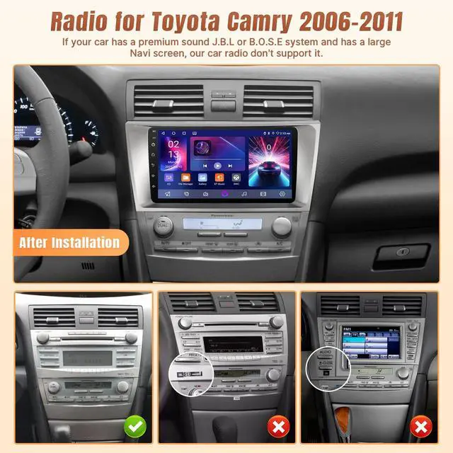 B: with J. B. L". Weve got you covered with online help, a user manual, and an install video! Let me know if you'd like any tweaks! ^^ Upgrade Android Car Radio for Toyota CamryDesigned specifically for Toyota Camry 2006 2007 2008 2009 2010 2011, our car radio stereo come with a 9 inch HD touchscreen radio to ensure a perfect blend with your vehicle ^^ Wireless CarPlay & Android AutoThis doule din car stereo for toyota camry 2007 supports iOS CarPlay and Android Auto. Supports access to navigation, phone contacts, music, etc. via siri or Google Assistant to help you enjoy a smarter, more convenient driving experience while focusing on the road ^^ In-dash GPS Navigation & 5G WiFi Connection The upgraded radio for toyota camry 2008 built in GPS module and 5G WiFi, support both online and offline navigation app from Google Play APP market, you will not get lost again during driving with the updated data from the navigation app. This android radio for 2006 camry allow install or delete android apps from Application Store, as the same as smart phone ^^ Steering Wheel Control & AHD Rear CameraNo need to modify car power cables with the plug and play wiring harness, supports original steering wheel control.