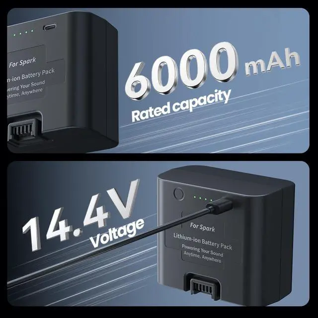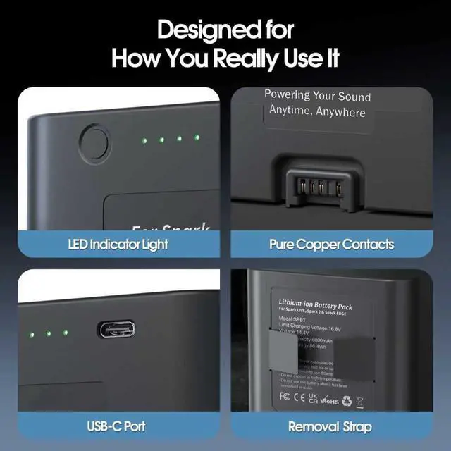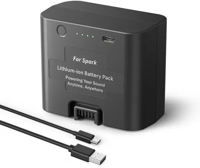 High Compatibility This battery uses the same high-quality cells as the original, making it highly compatible with three different smart amps: Spark LIVE, Spark 2, and Spark EDGE. It ensures stable and reliable power supply for your device. ^^ Powerful Performance With a large 6000mAh capacity, this battery pack delivers extended playtime: up to 12 hours for Spark 2, 10 hours for Spark EDGE, and 8 hours for Spark LIVE, meeting your long practice or performance needs. ^^ Convenient Removal Design Two soft square strips are built into the back of the battery to assist with removal. This design helps you take out the heavier battery safely and quickly whenever needed. ^^ Smart Power Indicator Equipped with four LED indicator lights, this battery makes it easy to check the remaining power. Press the button when not charging to display battery level (each light represents 25%). While charging, the lights flash progressively until fully charged, and all four lights remain solid green at 100%. ^^ USB-C Charging Port Wide compatibility with standard USB-C cables; package includes a USB-A to USB-C charging cable for added convenience.