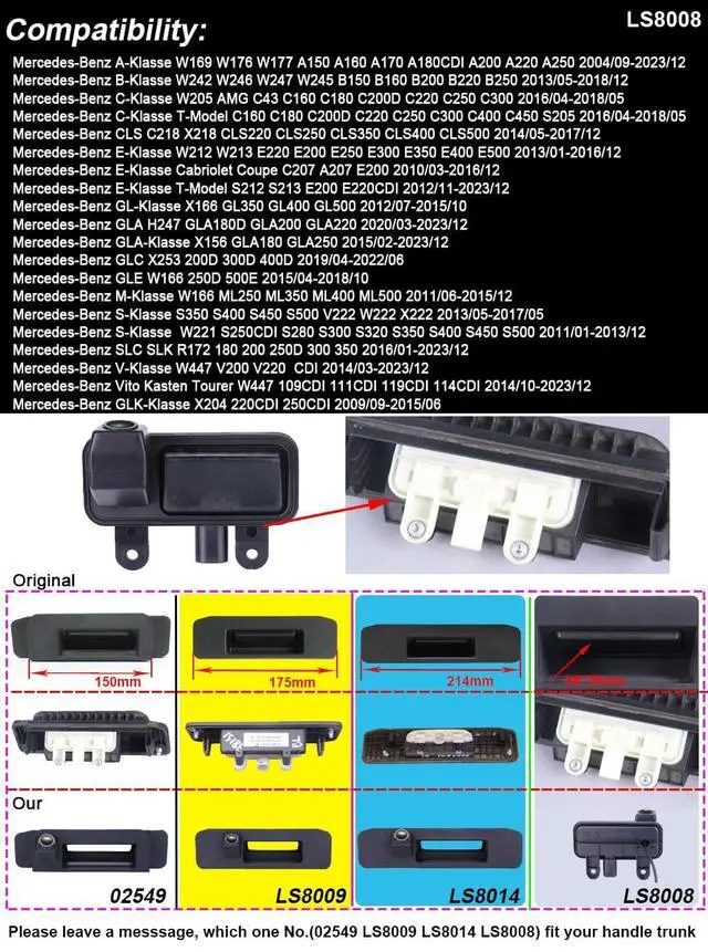 The difference in size between the two cameras: LS8009 = 52mm*175mm/150mm LS8014 = 52mm*214mm/170mmThis product could fit all of the following models as expected: Replacement for Mercedes Benz GLK-Class X204 GLK300 2013 (choose NO. LS8009); Replacement for Mercedes Benz GLA200 GLK200 GLK260 ML350 A180 A200 A260 GLE GLC ML-Class 2013 2014 2015 2016Replacement for Mercedes-Benz M Klasse W166 W176 X166 Bj. 2011-2015 mit comand (extra add stecker von Radio); Replacement for Mercedes Benz W166 Bluetwc 350 4. matic 2012 ( choose NO. LS8014)Since the same car model may have differences in different countries, please check the camera size and compare your car's installation carefully to avoid mistakes.