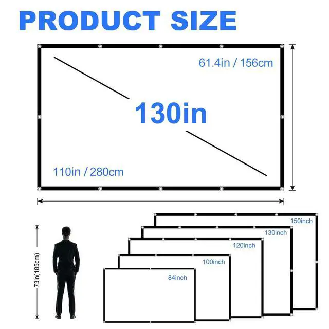 Projector Movie Screen Fabric 100% Crafted from natural polyester fabric, our 130 inch projection screen offers sharper and brighter visuals compared to many others on the market. Thicker and smoother, it supports 3D and HD movies with high color reflection. Available in a 16:9 format, projector screen it's for both living rooms and backyards. Each package includes 1 projector screen, 2 cords, and hooks for easy setup. ^^ 160 degree viewing angle130 inch diagonal Projector movie Screen movie, 4K Full HD, 16:9 aspect ratio, The projector screen is made of polyester high density silk, which is thicker than other ordinary screens, washable and soft, easy to clean.