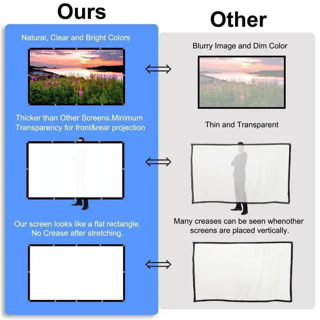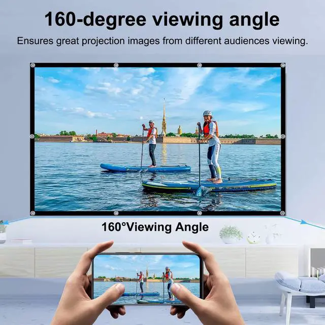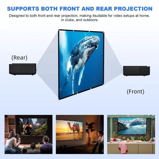 a little small design brings you more fun and even supports front and back projection ^^ Portable and Easy InstallationThis video projection screens lightweight and foldable design and put it in your backpack or suitcase without any damage, and then take it to wherever you want with storage bag. Most important, this movie screen for outdoor use coming with all the necessary tools(hooks, ropes), easy to set up, and the whole process was not complicated, one person only needs 5 minutes to install it. ^^ Wide Application The rear projector screen with good pictures quality and lightweight design is not only suitable for indoor, such as home theater, education, offices, media, theatre, beach, travel, patio, room classroom, or gaming outside, for projector screen outdoor.