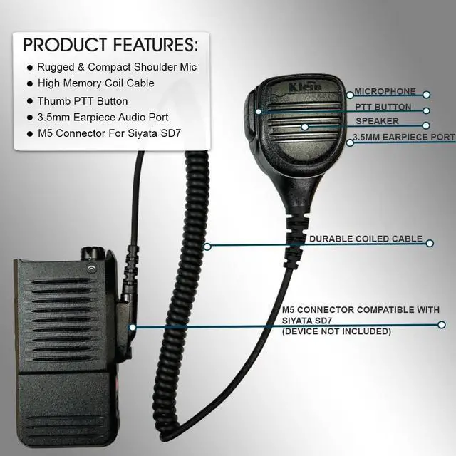 M5 CONNECTOR FOR SIYATA SD7: The Bravo PTT shoulder mic features an M5 connector, specifically designed for the Siyata SD7 device, delivering a flawless communication experience. ^^ RUGGED & WATERPROOF DESIGN - Built to withstand tough environments, this shoulder mic is IP56 waterproof certified and features a ruggedized cable for long-lasting durability in any weather condition. ^^ 3.5MM AUDIO EARPIECE PORT - Equipped with a 3.5 mm listen-only earpiece port, allowing you to connect an earpiece for crystal-clear sound quality, ensuring discreet and reliable communication.