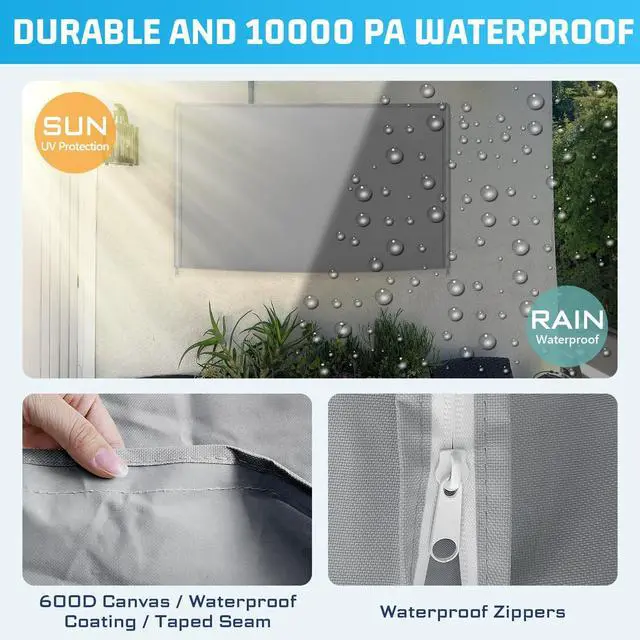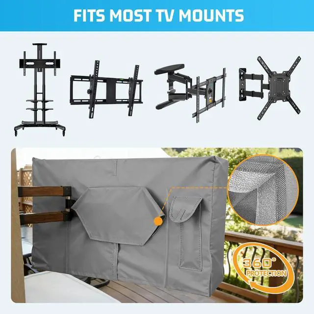 Outdoor Weatherproof TV Cover-It's made of a very heavy duty fabric - it's 600D Oxford, it's very resistant to wind, water and the like. It also keeps the harsh sun off your TV, has zipper closures all the way around. It keeps dust and airborne particles off your electronics which helps the life of expensive things ^^ Perfect Fit and