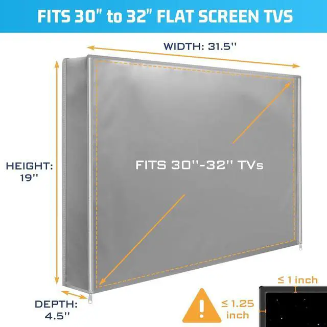Easy To Install-Size: 33"W x 23"H x 4.5"D, Diagonal: 40". Compatible with most television models 30-32 inches. Flaps on backside allow it to have a snug fit around the extension arm of the tv rack no matter which one of the many different styled support racks widely available you have. Like having a custom cover! (*Just make sure you check your TV size if you want it to fit right) ^^ Double Zipper Opening and Roll Up Option-There is a convenient side zippers and roll-up strap built into the design. And this cover has zipper instead of just. You do not completely remove the cover when viewing the TV, you just flip it up and over. Makes it much easier when you are done for the night ^^ Easy To Use & Covers Total TV-Easy to use and great coverage for outdoor TV. It does securely around the TV including closure around the bottom. The back areas and the bottom works great to totally enclose the TV and able to live through harsh weather & temperatures ^^ Protects Your TV for Years of Use- This is the perfect protection for the TV from getting dusty and dirtied. There is a pocket on the back for your remote to be protected as well.