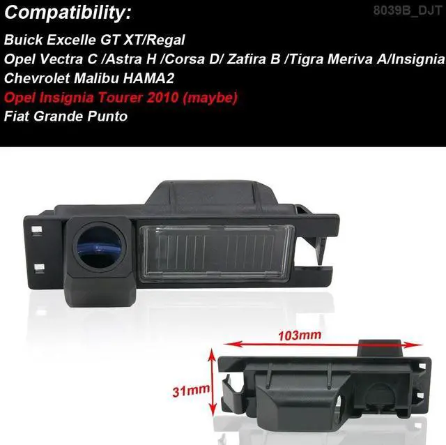 Dustproof Design: The reversing camera is designed to be waterproof and dustproof, enabling it to perform reliably in various adverse weather and road conditions, ensuring high-quality rearward vision in any situation. ^^ Compatible with Buick Excelle GT XT/Regal; Compatible with Opel Vectra C /Astra H /Corsa D/ Zafira B /Tigra Meriva A/Insignia; Compatible with Chevrolet Malibu HAMA2; Compatible with Opel Insignia Tourer 2010 (maybe); Compatible with Fiat Grande Punto; Compatible with Fiat doblo; Compatible with Fiat Stilo 3T; Compatible with Opel Vauxhall Signum 2003