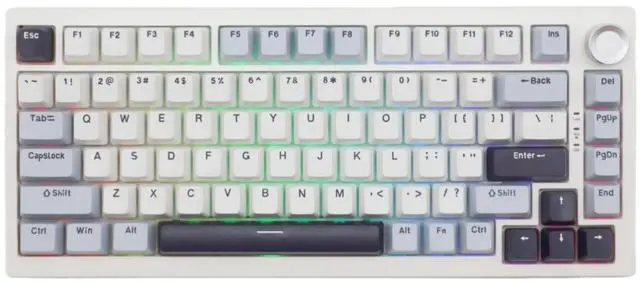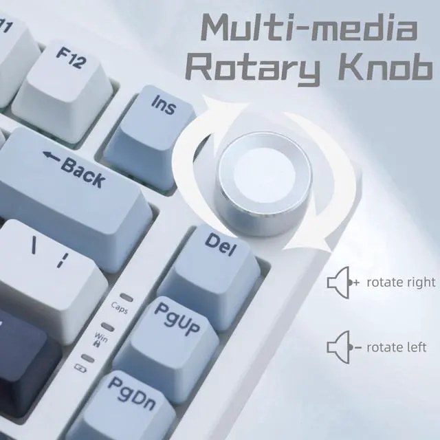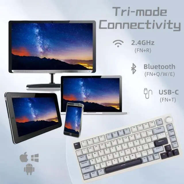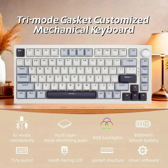 LAYOUT KEYBOARD: This gaming keyboard supports Win&MAC&Android system and improves desktop space utilization, equipped with the necessary arrow keys and a multi-functional rotary knob, provides more space for mouse movement, and is more suitable for gaming and productivity. ^^ HOTSWAP GASKET KEYBOARD This 75% layout mechanical keyboard is equipped with a hotswap socket and a gasket structure plate, supporting most of 3pin/5pin switches on the market, so that you can replace the switches as you like. ^^ LINEAR SWITCHES&PBT KEYCAPS This mechanical keyboard uses linear switches to provide a comfortable typing feel and longer switches life. PBT double-shot cherry profile keycaps not only provide ergonomics but also make sure the durability. ^^ LONG LIFE KEYBOARD It has 3 kinds of connectivity modes, wired Type-C and wireless Bluetooth & 2.4GH z receiver, built-in 4000mAh lithium battery. And to reduce the noise inside the keyboard, it uses multiple layers of noise-absorbing pad/foam made of different materials to provide you with a better typing and gaming experience. ^^ PROGRAMMABLE KEYBOARD This keyboard has its own driver to customize the backlits speed, brightness, mode, etc. And you can also DIY the function of the key.