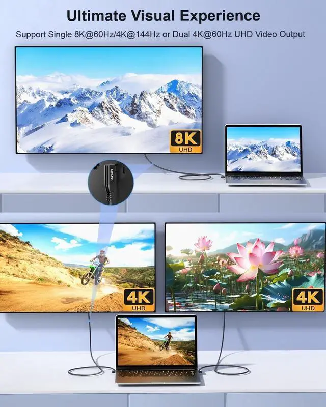 8K@60Hz & Dual 4K@60Hz Video Output Deliver crystal-clear, lag-free visuals with support for 8K@60Hz or dual 4K@60Hz video transmission. Ideal for home office, desktop workspace, screen extending & mirroring, 4K movie streaming, graphic design and high-definition gaming, this USB-C video cable seamlessly connects your laptop, MacBook to external monitors, portable monitors, TVs, projectors and docking stations for an immersive viewing experience.