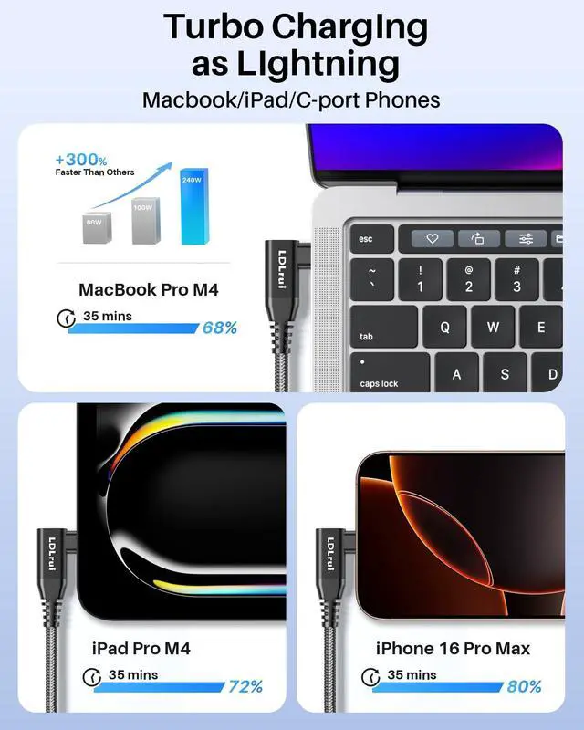 USB 3.0 cables(Note: Max speed requires both connected devices to feature Thunderbolt 3/4 ports) ^^ 240W PD Fast Charging with E-Marker Chip Pair with a compatible charger to unlock 240W Power Delivery fast charging for laptops, tablets and smartphones, slashing charging downtime and getting you back to work in no time. Built-in E-Marker chip ensures safe, efficient power delivery, protecting your devices battery during high-speed chargingan essential on-the-go solution for busy professionals. ^^ Universal Compatibility & 6FT Ideal Length This 6FT USB4 cable works flawlessly with a full range of