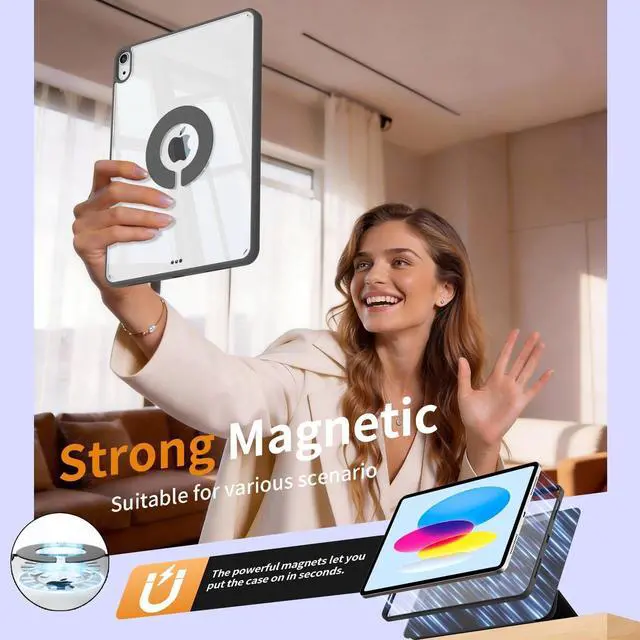 (Note: Pencil is not included in the package) ^^ MAGENETIC CLEAR HARD PC BACK SHELLThe back shell of the Clear iPad 10th Generation Case is made of transparent hard PC material, which provides excellent protection and can perfectly display the original appearance of your 10.9 inch iPad. (Please tear off the protective film on both sides of the clear case before use). The round magnet can be attached to the protective case or any other object with a magnet. ^^ HIGH QUALITY MATERIALS & PRECISE CUTOUTSThe outside of the cover is made of high quality PU leather and flexible soft tpu, the inside is made of soft microfiber lining, which can effectively prevent screen scratches. It is precision machined to accurately match all keys and openings. So you can easily access all the controls and functions, such as touch ID, camera, speakers, ports and buttons. ^^ STABLE TRIFOLD STAND & Y STANDThis A3356 Smart Magnetic Case can be adjusted to a stable trifold stand, you can watch videos at a 65 angle and type at a 30 angle. It also can be adjusted to a Y-shaped stand that provides a higher usage angle, so it can be used in a variety of scenarios.