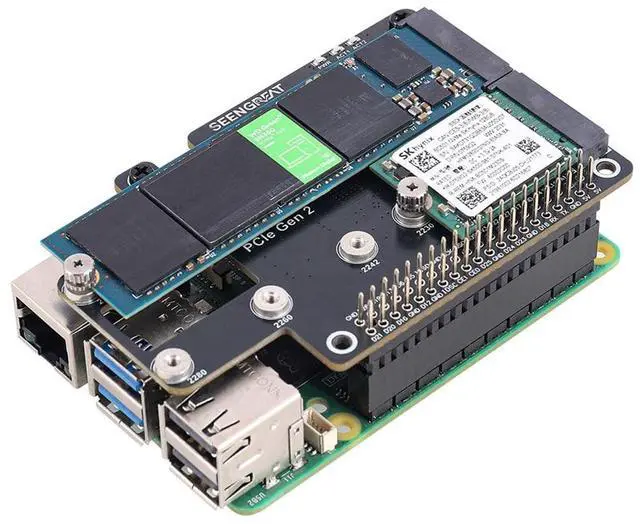 Enable dual NVMe SSD storage expansion for Raspberry Pi 5, significantly boosting system performance and file transfer speeds with PCIe Gen2 technology. ^^ Specifically designed for the Pi 5 PCIe interface, supporting PCIe x1 Gen2 for faster data rates than Micro SD cards and enhanced workflow efficiency. ^^ Supports booting directly from NVMe SSD, eliminating slow Micro SD card bottlenecks and enabling quick startup for Raspberry Pi 5 projects. ^^ Compatible with multiple M. 2 SSD sizes (2230/2242/2260/2280), offering flexibility for various NVMe drive installations and storage upgrades. ^^ Complies with HAT+ standard for auto-detection by Raspberry Pi firmware, featuring onboard LED indicators for easy status monitoring and reliable operation.