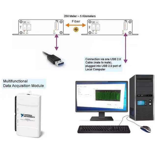 USB 2.0 devicePackage: 1. 1 x transmitter (client side). 2. 1 x receiver (host side). 3. 1 x Power supply adapters DC 5~12V with US plug for the transmitter. 4. 1 x USB 2.0 cable, the receiver powered by the local PC via USB cable. 5. 1 x Manual.