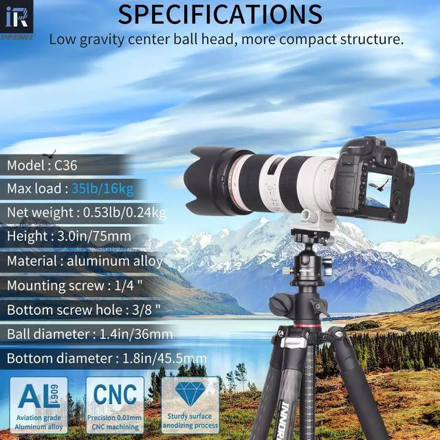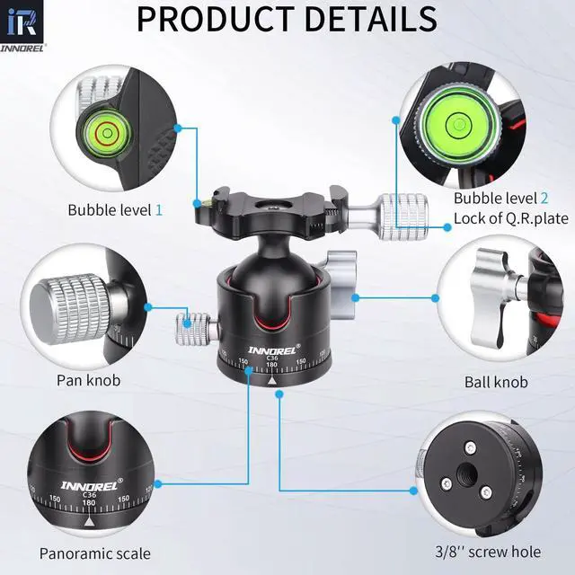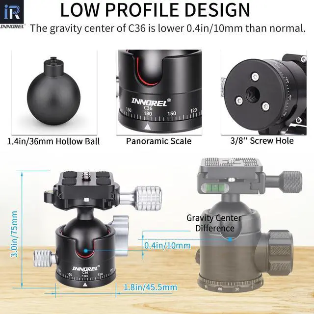 INNOREL C36 Low Profile Tripod Ball Head Universal 360 Panoramic Metal BallHead for DSLR Camera Tripod Monopod Camcorder Slider with Arca Swiss Plate 36mm Ball with 1/4" to 3/8" Screw Load 35lb/16kg